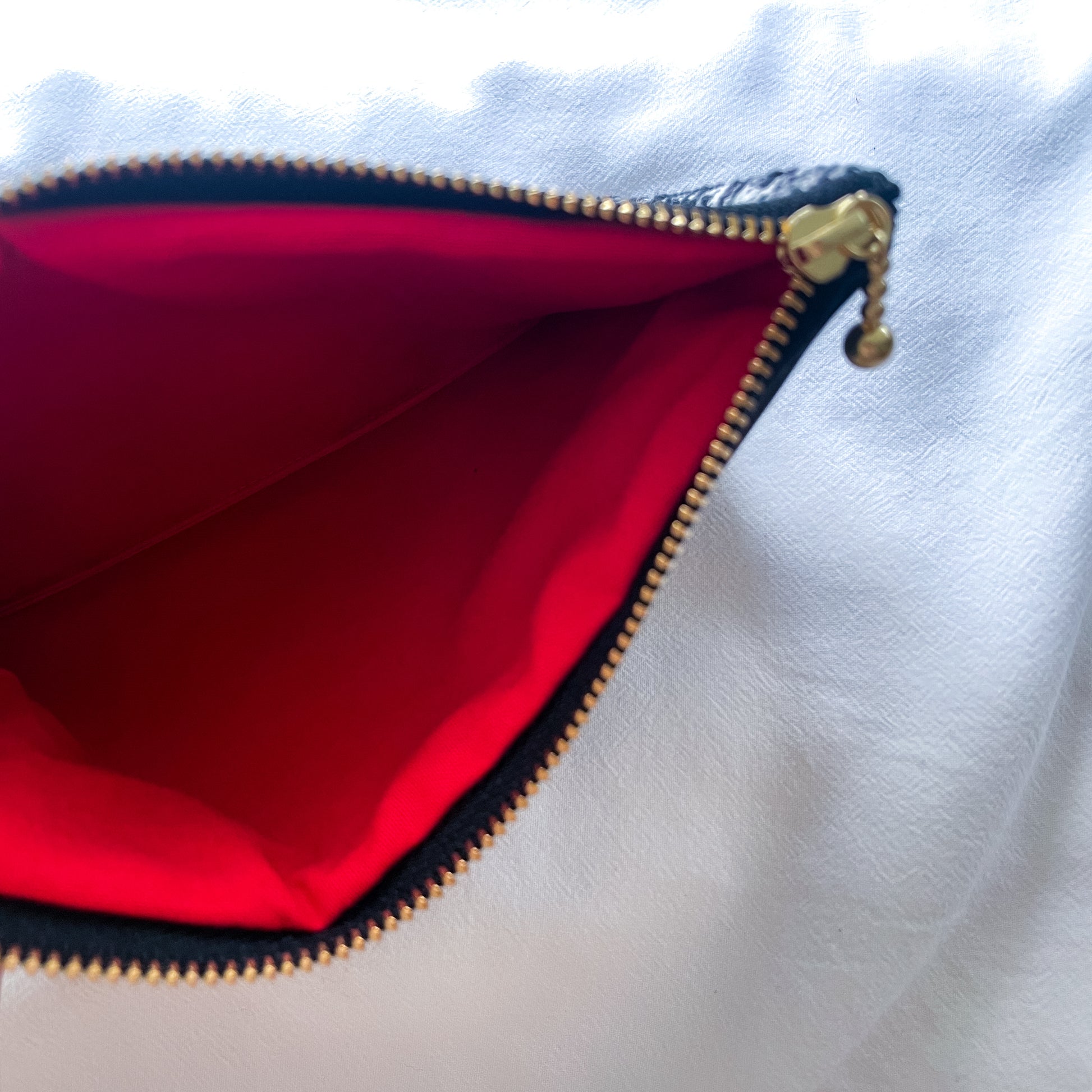 表面にはララインサール織の美しい幾何学デザインの手織り/手縫いの生地を使用し、裏面にはしっとりとした柔らかさを持ちながら耐久性にも優れた黒のディアスキン(鹿革)の端材を使用しています。