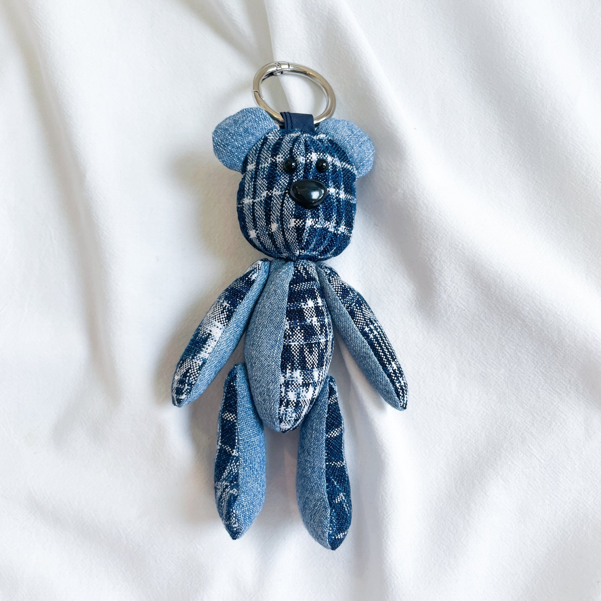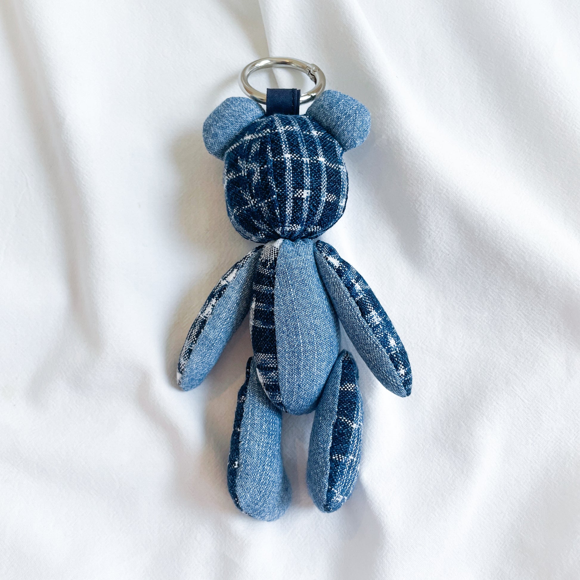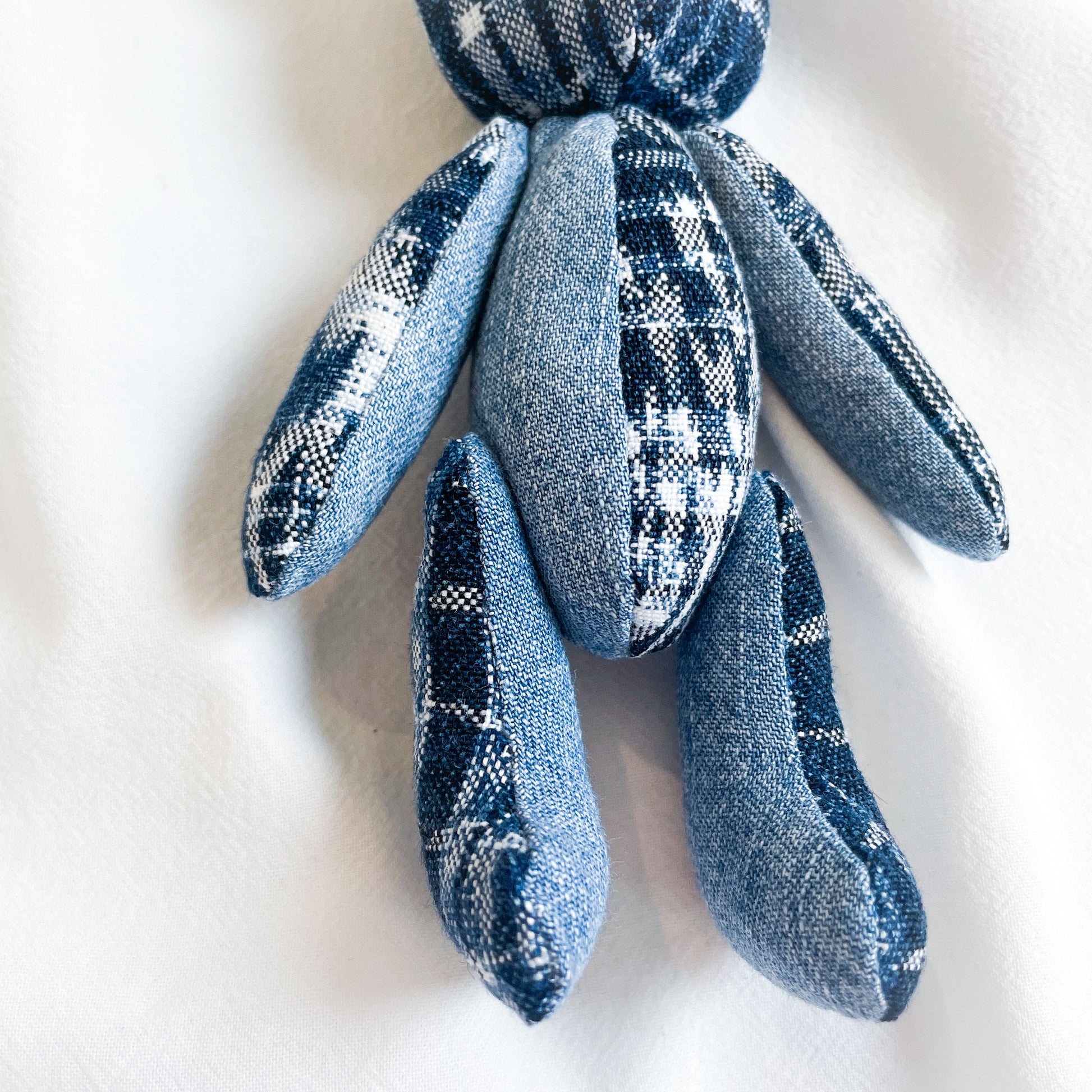 グアテマラの伝統的な絣生地とユーズドのデニムシャツを組み合わせて作成したくまチャーム。