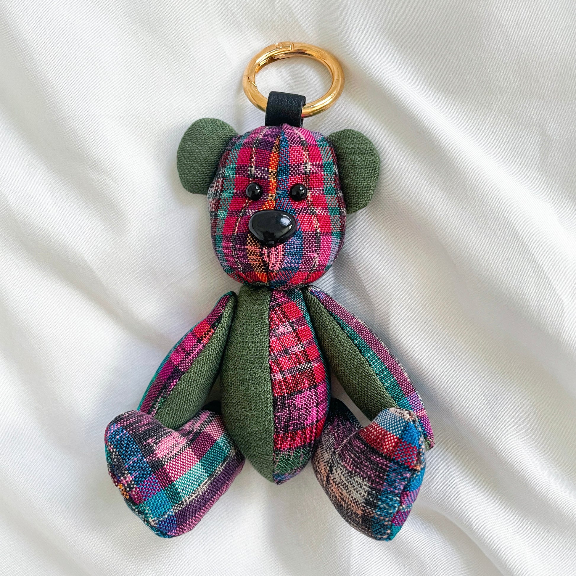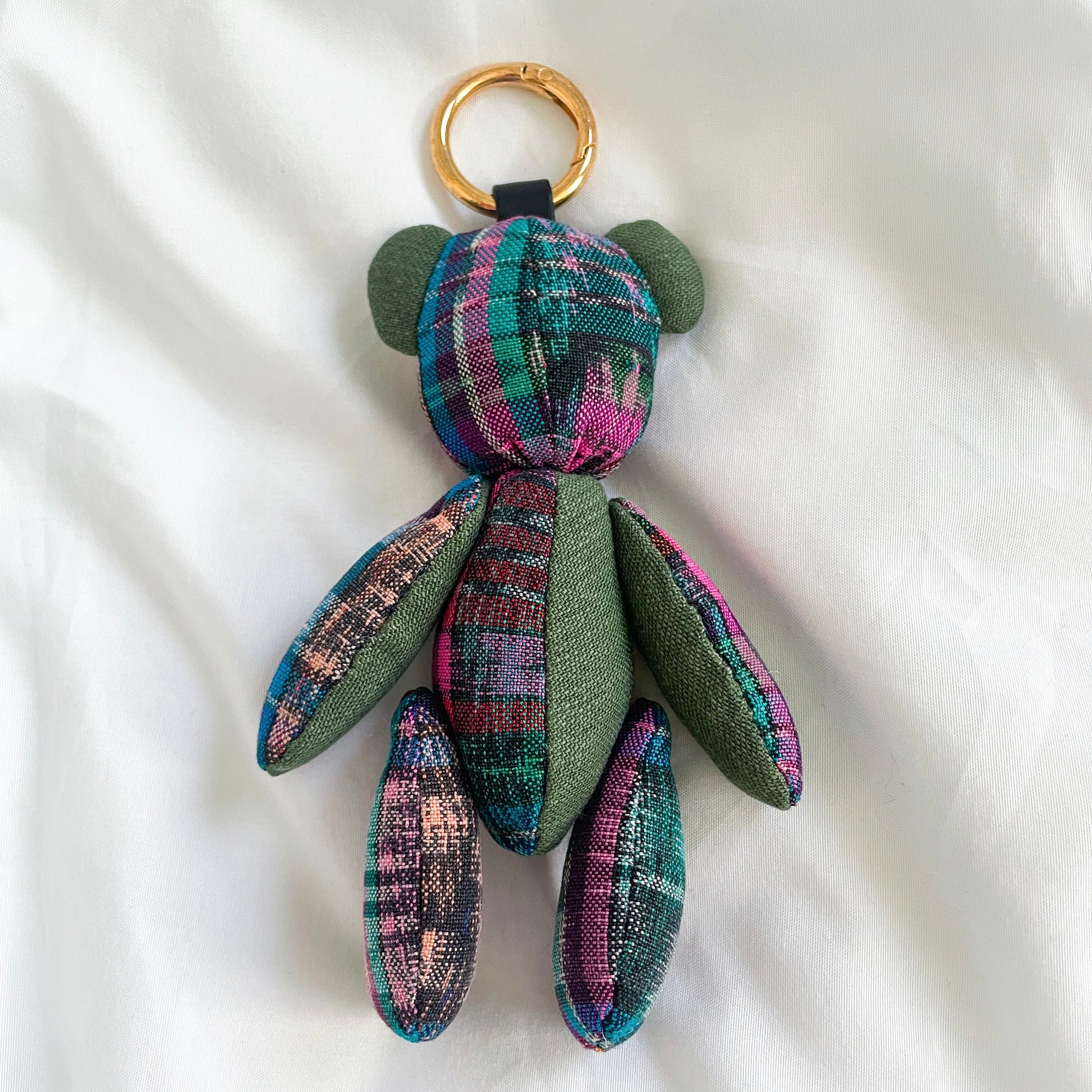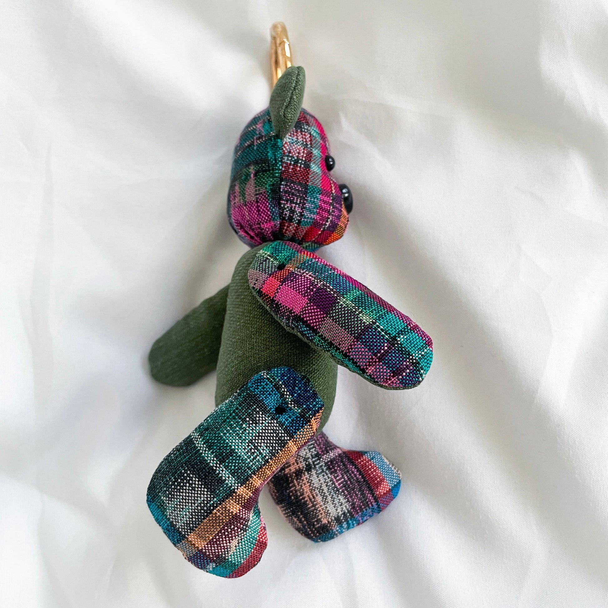 グアテマラの伝統的な絣生地とユーズドのミリタリーシャツを組み合わせて作成したくまチャーム。